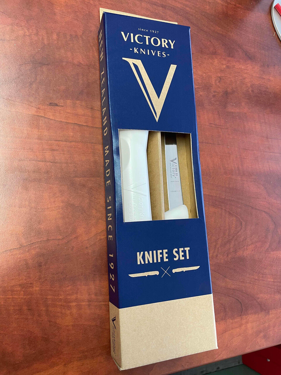 Victory Filleting Knife gift set, includes the very popular 2/506/22/115W handle Narrow Filleting Knife, S401 Plastic sheath, Tramontina Bait Knife 22901/006 and Fish Tweezers all packed in the Victory Knife gift box.