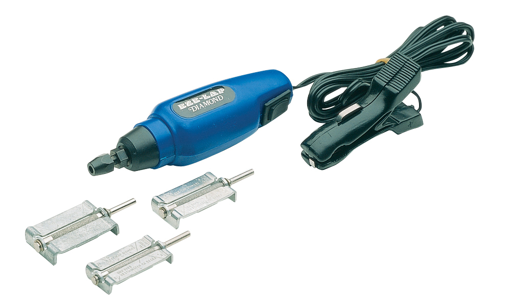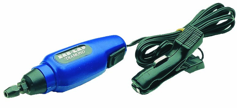 The EZE-LAP CSK is a 12 volt chainsaw sharpening kit that can be used with both battery terminals and car cigarette lighters to power the sharpener when working outdoors.