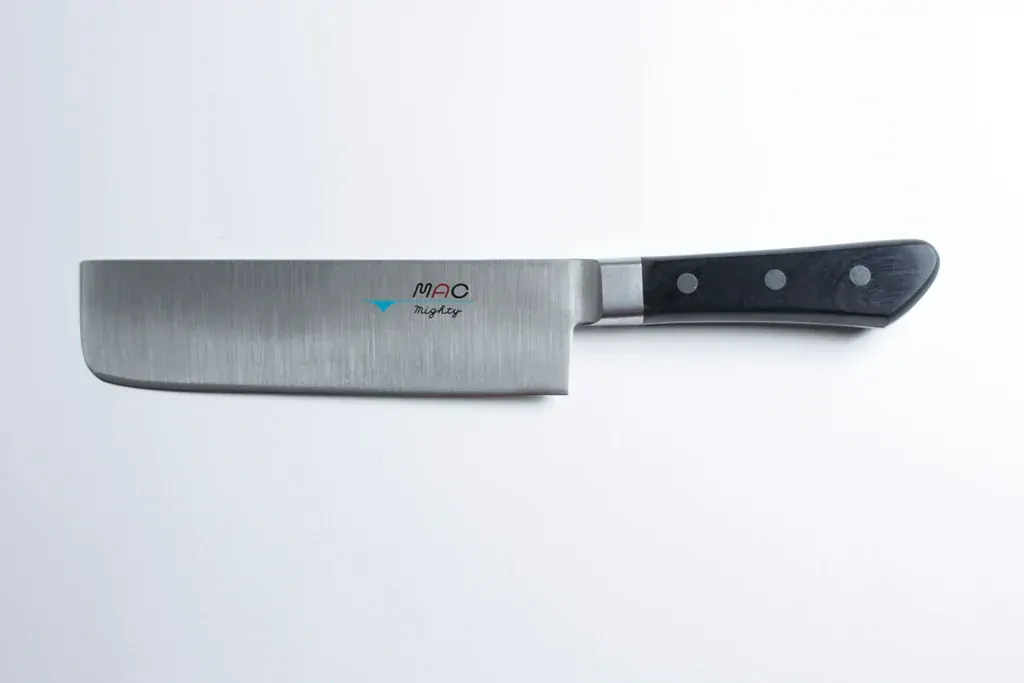The MAC Professional Japanese Vegetable Cleaver (MJU-65) is a 17 cm vegetable-focused knife designed for slicing and chopping fruit and vegetables. The straight edge supports full contact with the board without rocking.
