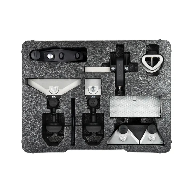 This kit contains all the jigs you need to sharpen all types of knives, scissors, lawnmower blades, axes as well as short chisels and carving tools. The perfect package to sharpen all your cutting tools at home or in the workshop. And to store your jigs neatly and tidily of course!