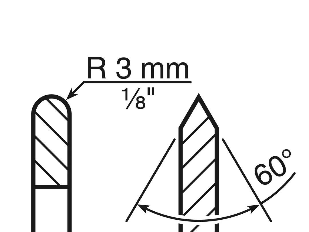 Honing wheel dimensions - Diameter: 120 mm (4 ¾") / 93 mm (3 5/8"), Radius/angle: 3 mm (1/8") / 60°