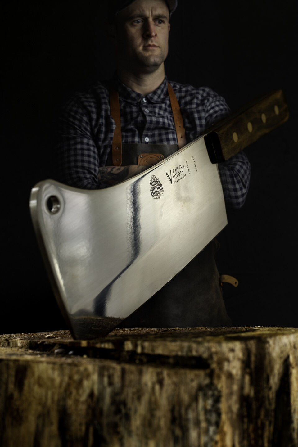The Cleaver is made from 5.5mm German Stainless Steel and treated with the tried and tested manufacturing techniques here at Victory Knives, heat treated to 54HRC and with a half grind up the blade and fitted with a custom scales being New Zealand native wood Heart Rimu. Weighing in at 875 grams this is a solid and hardworking tool.